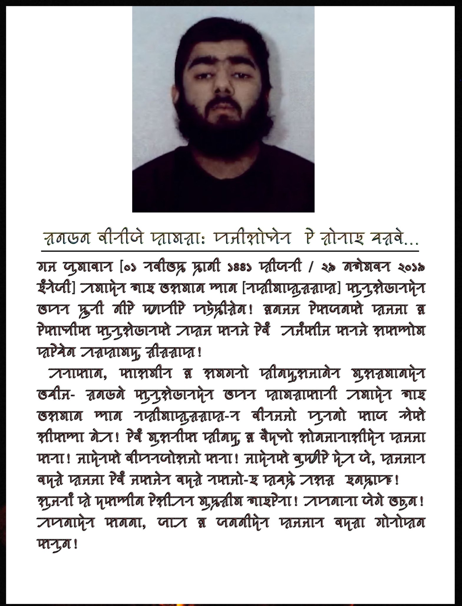 গত জুমাবার [০১ লা রবিউস সানী ১৪৪১ হিজরি / ২৯ নভেম্বর ২০১৯ ইংরেজি] আমাদের ভাই উসমান খান [রহিমাহুল্লাহ] ক্রুসেডারদের উপর ছুরি নিয়েই ঝাঁপিয়ে পড়েছিলেন! অন্তত একজনকে হত্যা ও একাধিক ক্রুসেডারকে আহত করতে এবং আতঙ্কিত করতে সক্ষম হয়েছেন আলহামদু লিল্লাহ!আরাকান, কাশ্মির ও সমগ্র হিন্দুস্তানের মুসলমানদের উচিত- লন্ডনে ক্রুসেডারদের উপর হামলাকারী আমাদের ভাই উসমান খান রহিমাহুল্লাহর বীরত্বপূর্ণContinue reading “লন্ডন ব্রিজে হামলাঃ প্রতিশোধের এই লড়াই চলবে…”