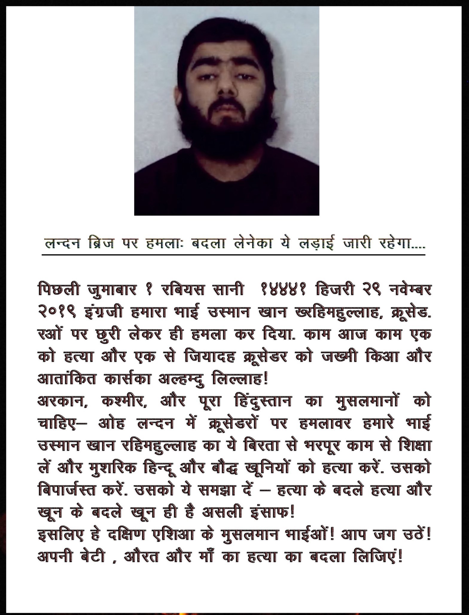 আরাকান, কাশ্মির ও সমগ্র হিন্দুস্তানের মুসলমানদের উচিত- লন্ডনে ক্রুসেডারদের উপর হামলাকারী আমাদের ভাই উসমান খান রহিমাহুল্লাহর বীরত্বপূর্ণ কাজ থেকে শিক্ষা গ্রহণ করা! এবং মুশরিক হিন্দু ও বৌদ্ধ সন্ত্রাসীদের হত্যা করা! তাদেরকে বিপর্যস্ত করা! তাদেরকে বুঝিয়ে দেওয়া যে, হত্যার বদলে হত্যা এবং রক্তের বদলে রক্তই হচ্ছে প্রকৃত ইনসাফ!